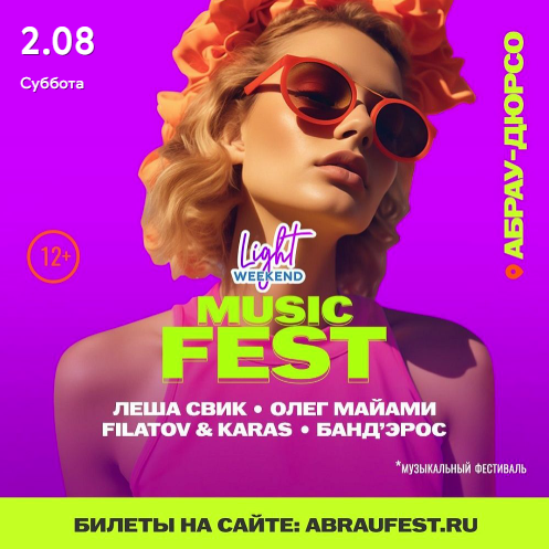 Только 2 августа твои любимые артисты на фестивале LIGHT WEEKEND 2025 — ЛЁША СВИК, ОЛЕГ МАЙАМИ, FILATOV & KARAS, БАНД’ЭРОС! Живой звук, невероятная атмосфера и прекрасное настроение!